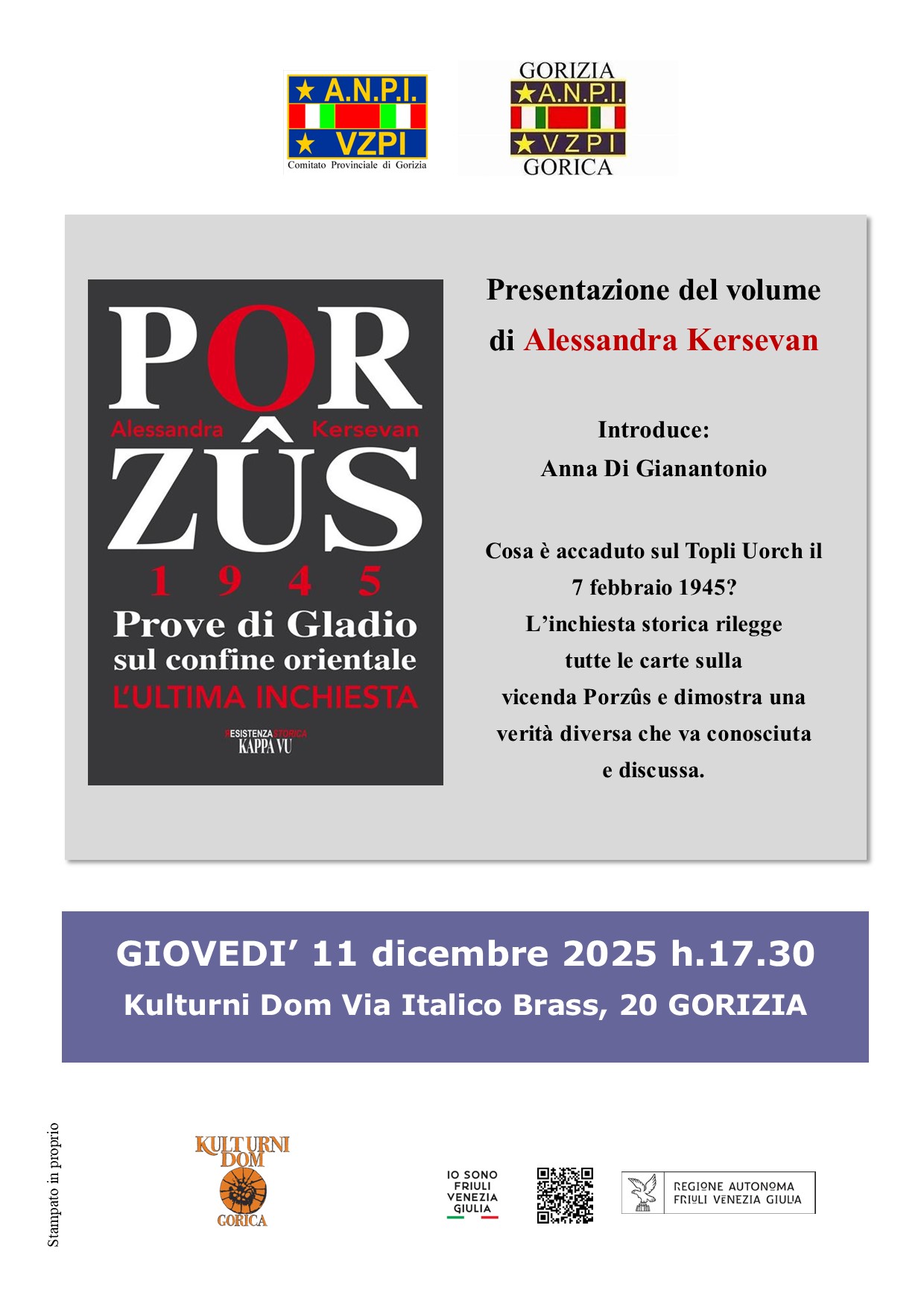 Kulturni dom ul. Brass 20, GoricaPredstavitev knjige Porzûs avtorice Alessandre Kersevan. Z njo se bo pogovarjala Anna di Gianantonio