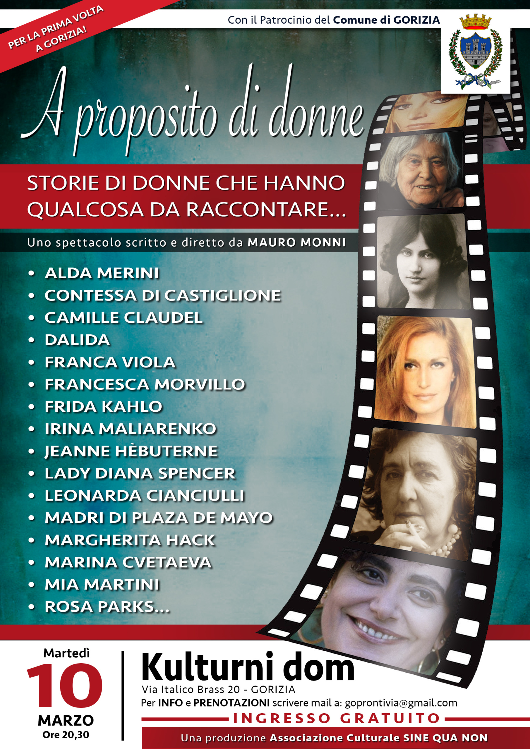 Kulturni dom ul. Brass 20, Gorica, IL, ItalyZgodbe žensk, ki imajo kaj povedati... Predstava, ki združuje zgodbe 20 ženskih osebnosti, ki so s svojim zgledom pustile neizbrisen pečat prihodnjim generacijam. V italijanščini - Prost vstop