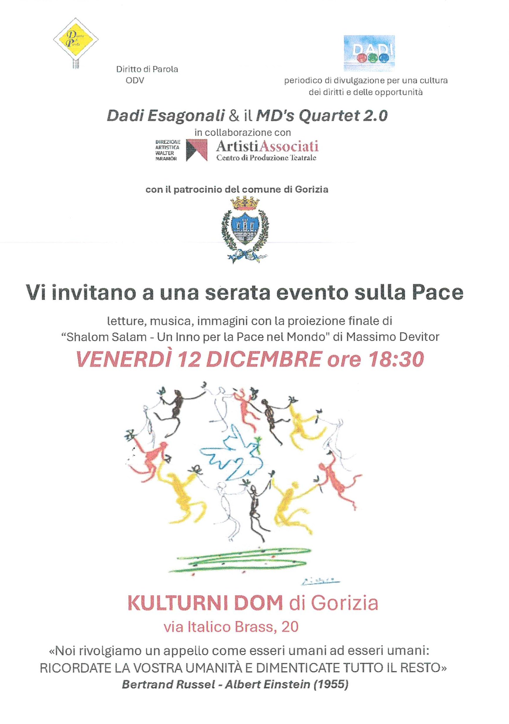 Diritto di Parola ODV, Dadi Esagonali in MD's Quartet 2.0  v Sodelovanju z Artisti Associati Vabijo na večer branja, glasbe, slik in zaključne projekcije videa "Shalom Salam" – Himna za mir v svetu - Massima…