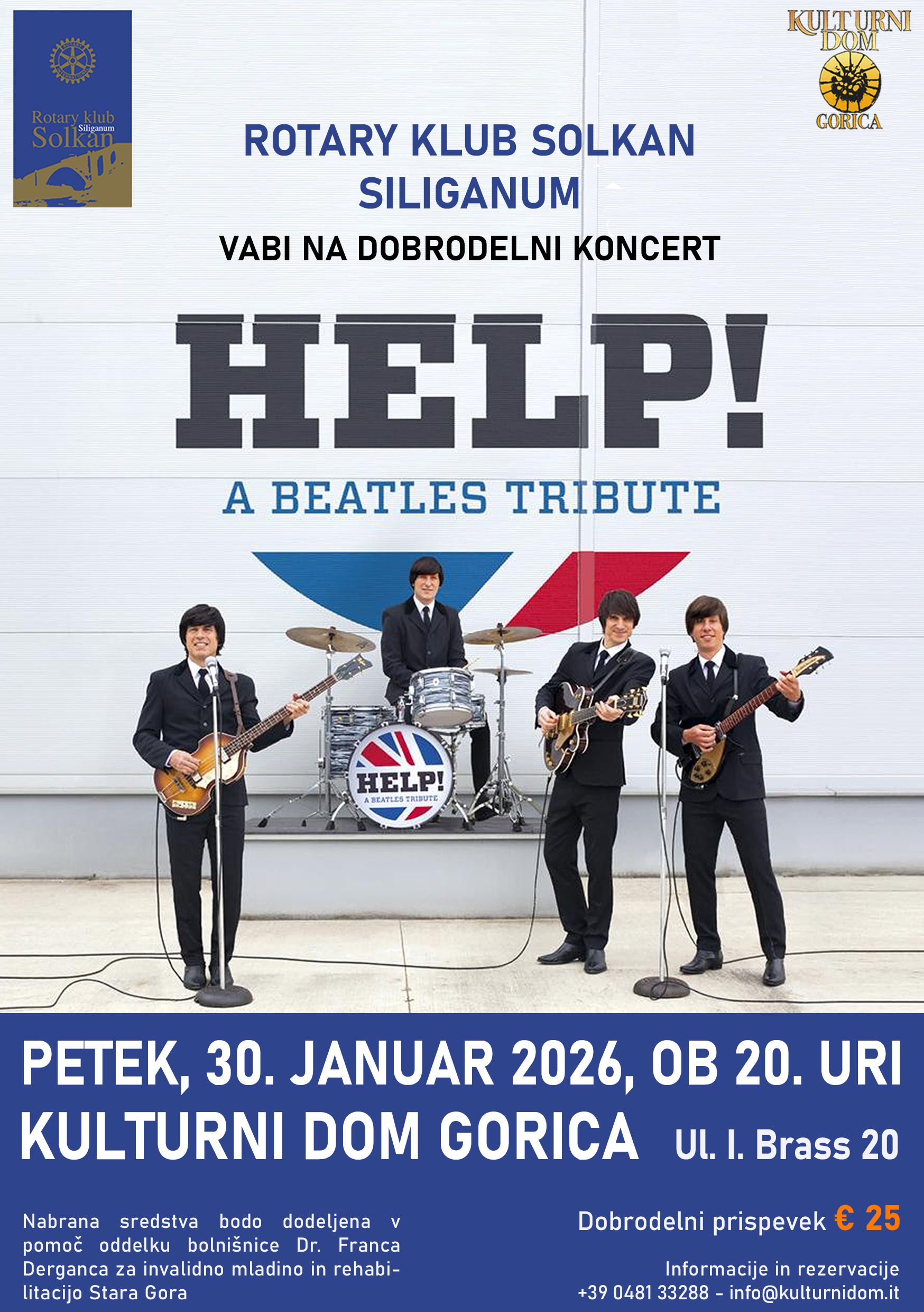 Na pobudo Rotarijskega kluba Siliganum iz Solkana (pri Novi Gorici), bo na vrsti poseben solidarnostni-dobrodelni koncert, na katerem se bo ponovno predstavila na odru goriškega kulturnega hrama priznana slovenska glasbena skupina Help! – A Beatles tribute iz Ljubljane, ki izpostavlja najbolj razpoznavne uspešnice legendarne britanske pop in rock skupine iz Liverpoola. Nabrana sredstva bodo dodeljena v pomoč oddelku bolnišnice Dr. Franca Derganca za invalidno mladino in rehabilitacijo Stara Gora.