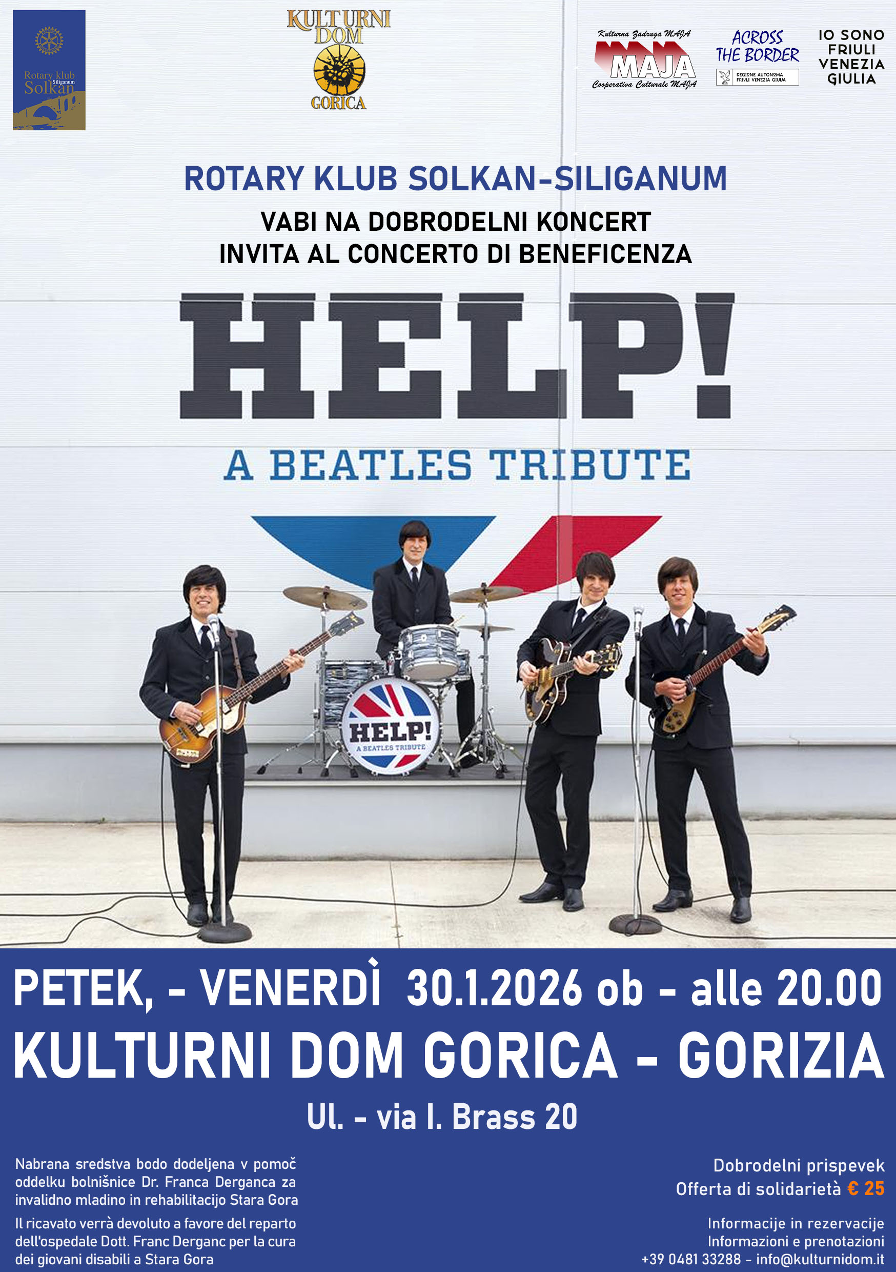 Evento musicale d’eccezione di beneficenza: “Omaggio ai Beatles”, con le più belle ed indimenticabili canzoni del famoso gruppo di Liverpool. Il tributo sarà affidato al noto gruppo cover sloveno “Help! A Beatles tribute” di Lubiana. Il ricavato sarà devoluto a favore del reparto dell’ospedale dott. Franc Derganc per la cura dei bambini disabili a Stara Gora (Slo).