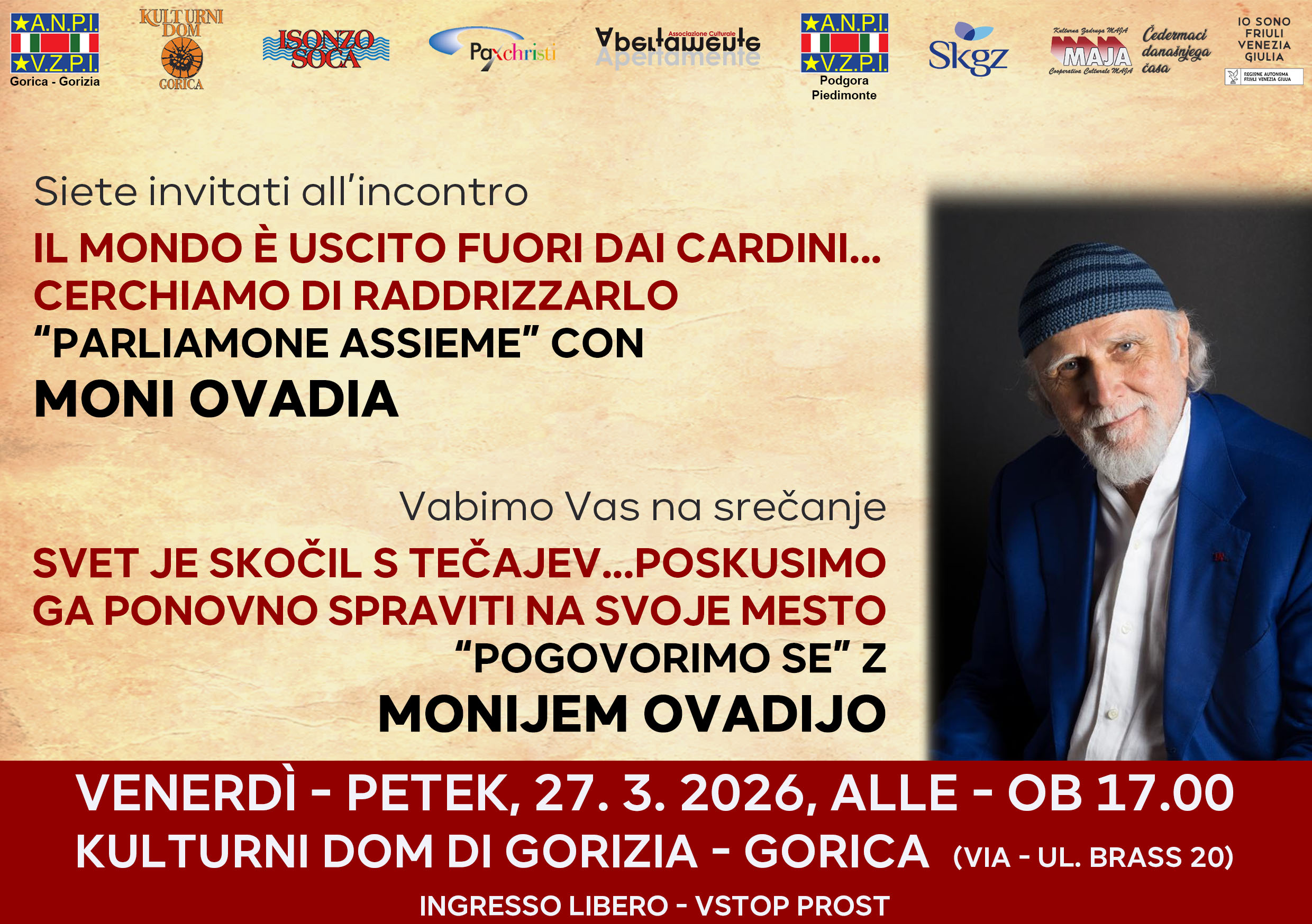 Na srečanju bo prisoten priznani igralec, kantavtor, pisatelj in glasbeni producent Moni Ovadia, ki bo spregovoril o zapletenem položaju sodobnega sveta, s posebnim poudarkom na aktualnih vojnah in razmerah v Gazi.